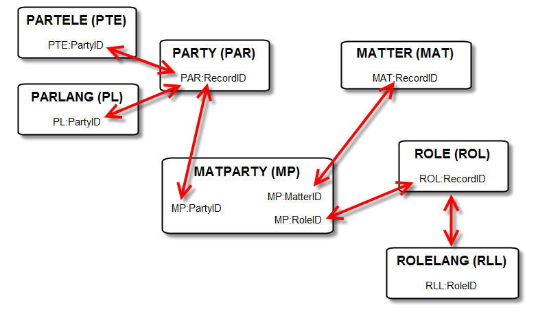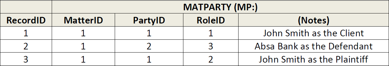 The Matter’s Parties are stored in the MatParty table which is a joining table between the Matter and Party tables.
