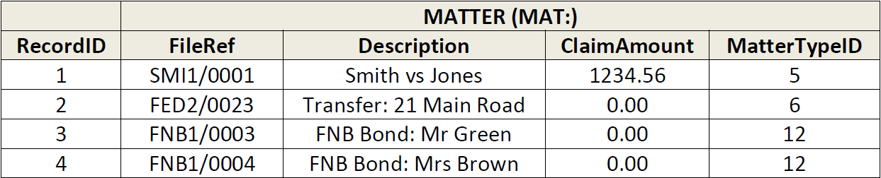 SQL: SELECT RecordID, FileRef, Description, ClaimAmount, MatterTypeID FROM Matter