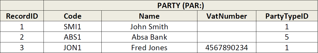 SQL: SELECT RecordID, Code, Name, VatNumber, PartyTypeID FROM Party