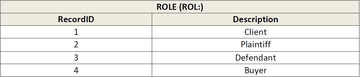 the Plaintiff role and RoleID = 3 is the Defendant role. Roles are stored