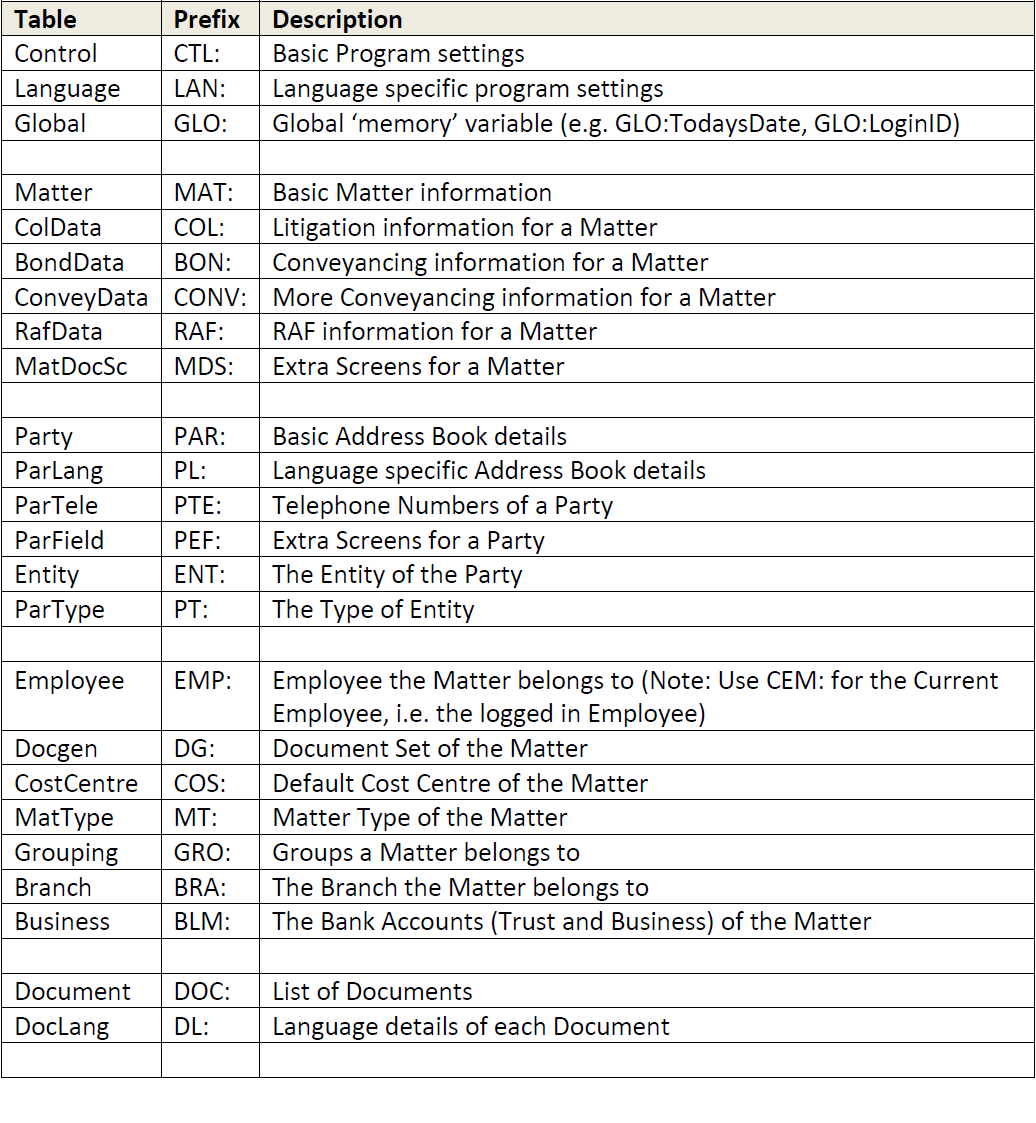 To find out the table and name of a particular database column, load the LegalSuite program and go to the relevant form and hover your cursor over an field until the tooltip appears. The table prefix and column name is displayed in the last line of the tooltip.