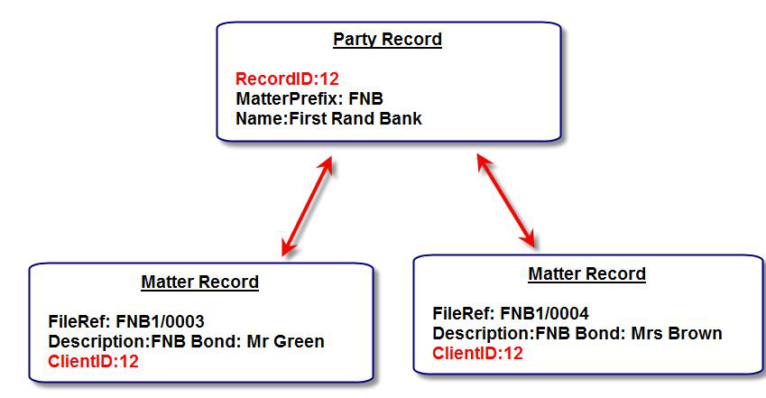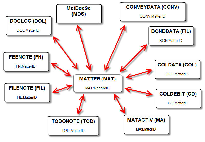 An attorney typically has numerous Clients (stored in the Party table) and each Client may have one or more Matters. Most of the information regarding a Matter is stored in the Matter table, but additional Matter information may also be found in ColData, ConveyData and BondData depending on the type of Matter.
