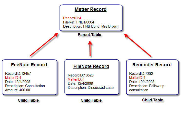 Parent tables are those which have tables linked to them in a one-to many relationship. The Matter table is often the Parent to numerous child tables. For example, the File Notes, Fee Notes and Reminders are all children of the Matter table.